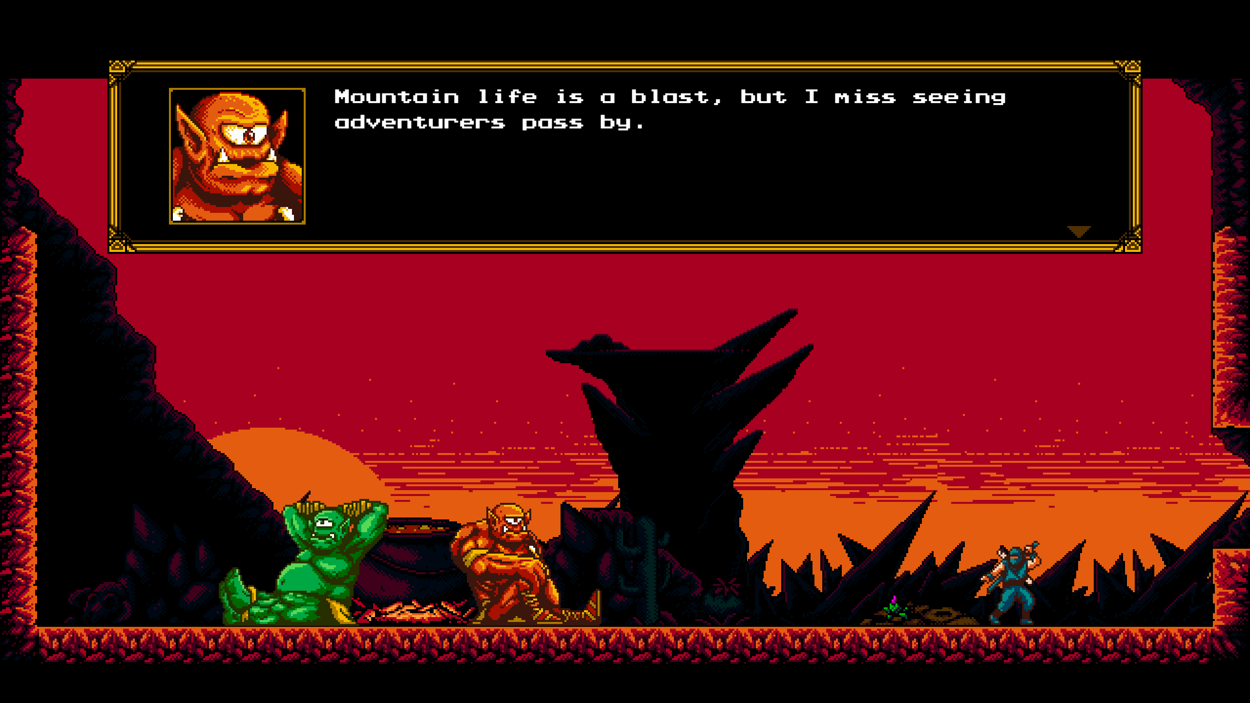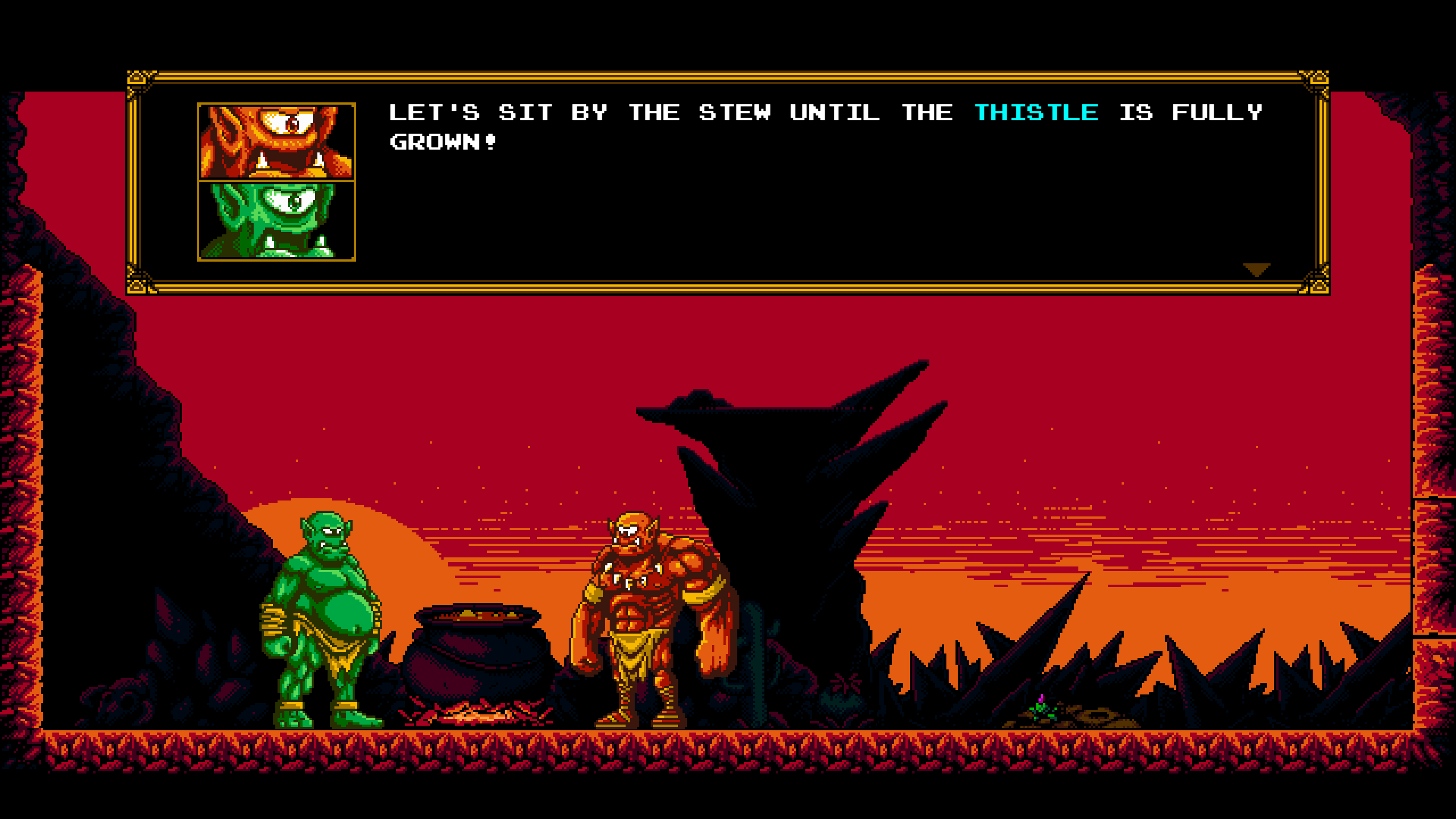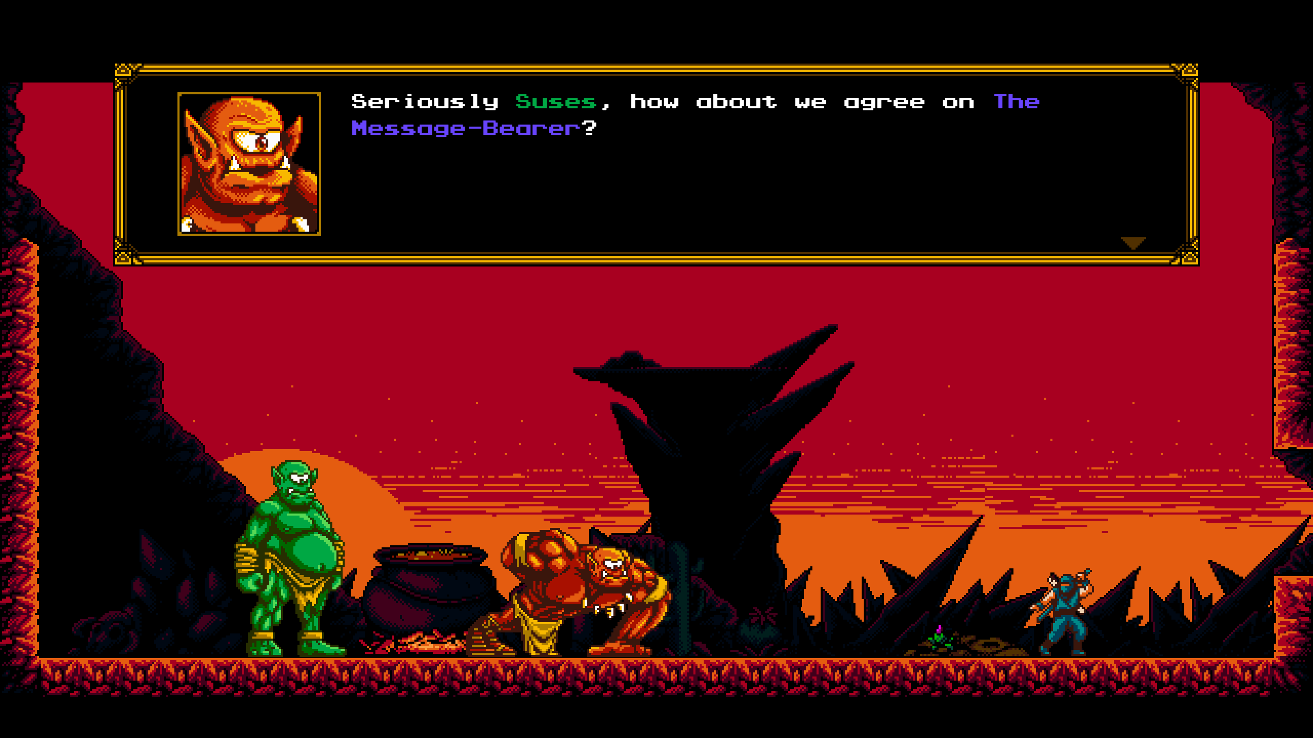 Ninja enters the room of Colos and Suses. In the room is a flowerbed with a tiny pink flower bud sprouting forth from it, and the two colossi brothers, Colos and Suses, who are relaxing next to a pot of simmering stew. Colos and Suses reminisce about humans for a bit until they finally notice Ninja. The duo shout in unison about how they are surprised by this shocking turn of events. Colos and Suses stand up and take a closer look at Ninja, noticing that he bears the scroll. Suses tries to ask Ninja if he's The Messenger but forgets the actual name of this important role. Colos and Suses throw potential names back and forth, trying to remember the title name, and settle on calling Ninja "The Message-Bearer." They decide to test his mettle and engage him in combat.