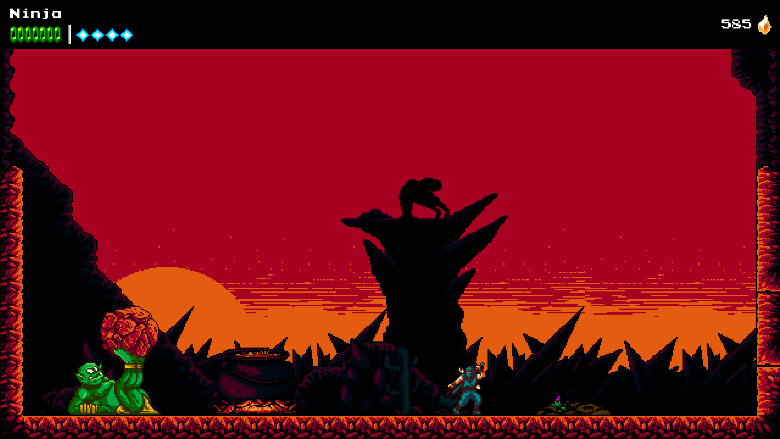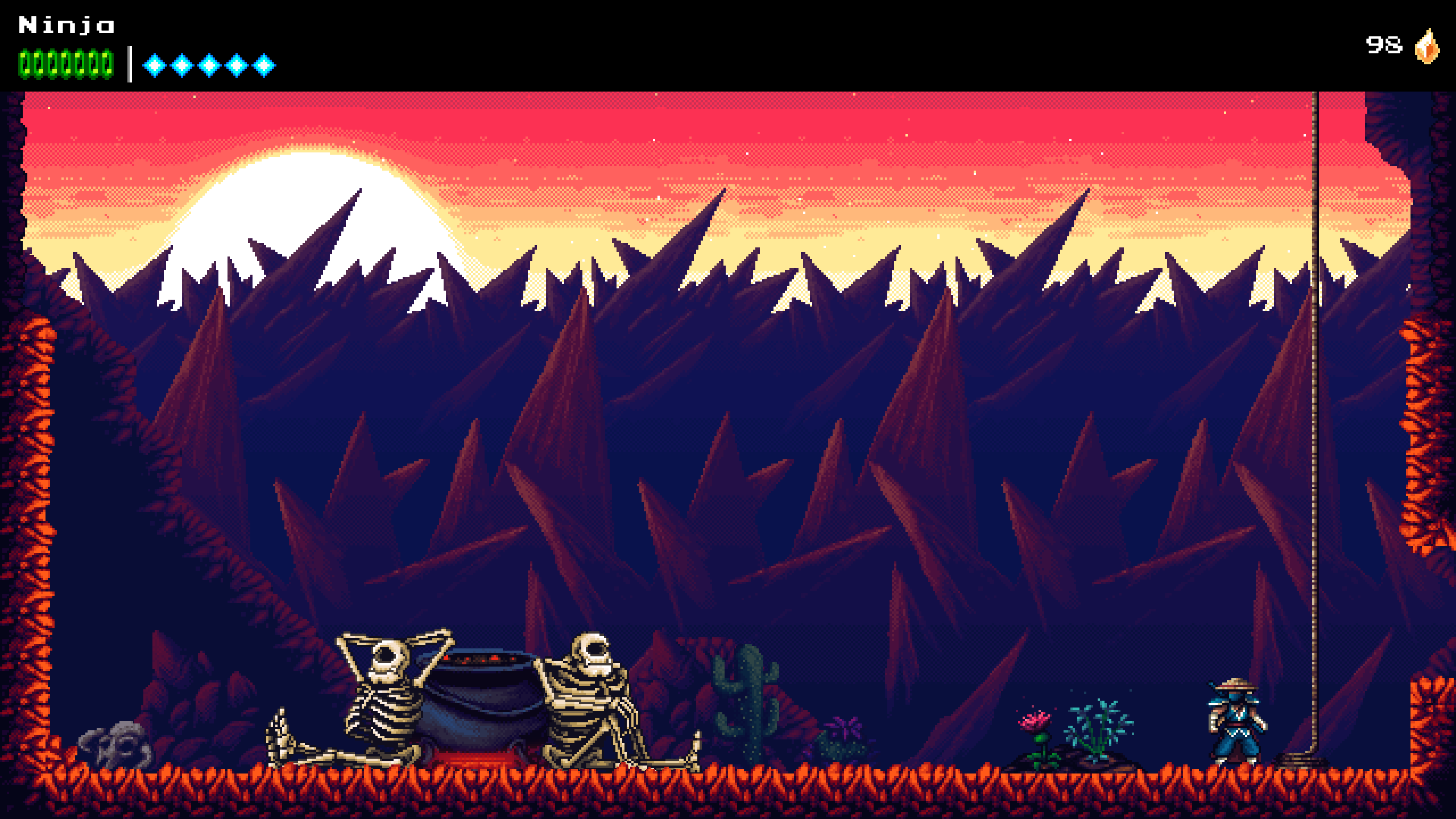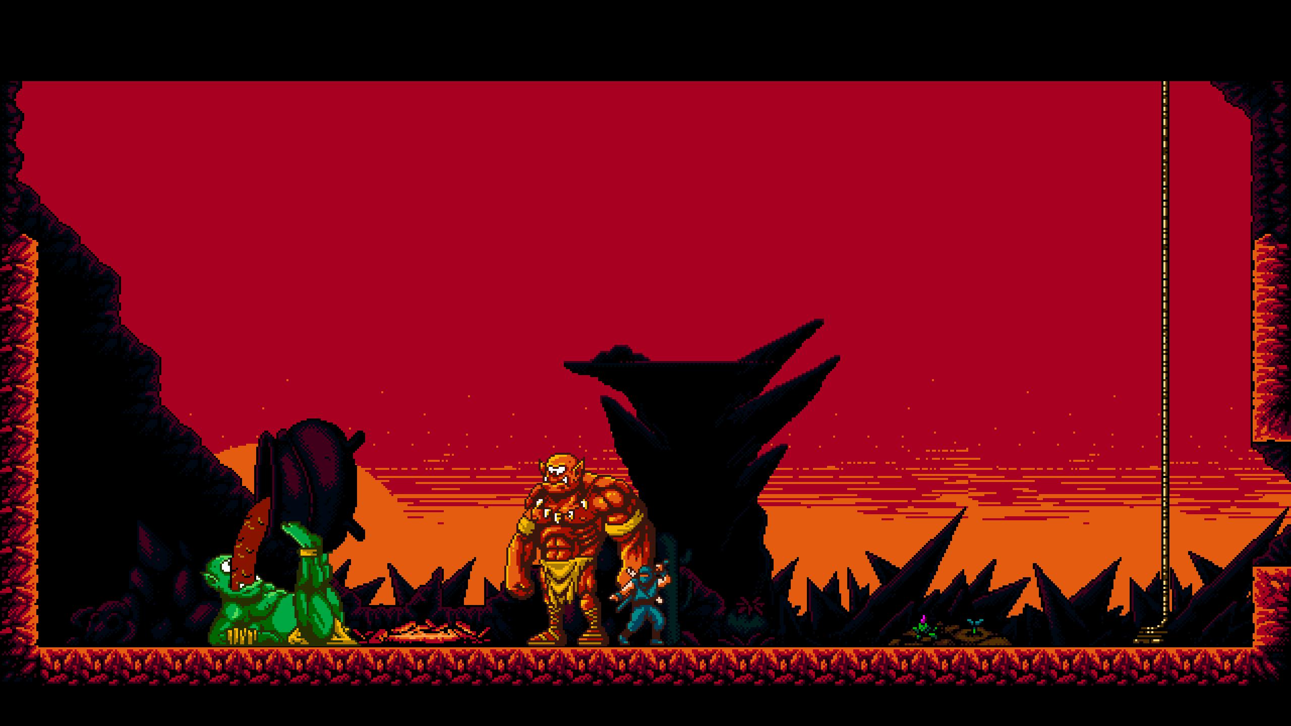 Ninja enters the room of Colos and Suses. In the room is a flowerbed with a tiny pink flower bud sprouting forth from it, and the two colossi brothers, Colos and Suses, who are relaxing next to a pot of simmering stew. Colos and Suses reminisce about humans for a bit until they finally notice Ninja. The duo shout in unison about how they are surprised by this shocking turn of events. Colos and Suses stand up and take a closer look at Ninja, noticing that he bears the scroll. Suses tries to ask Ninja if he's The Messenger but forgets the actual name of this important role. Colos and Suses throw potential names back and forth, trying to remember the title name, and settle on calling Ninja "The Message-Bearer." They decide to test his mettle and engage him in combat.