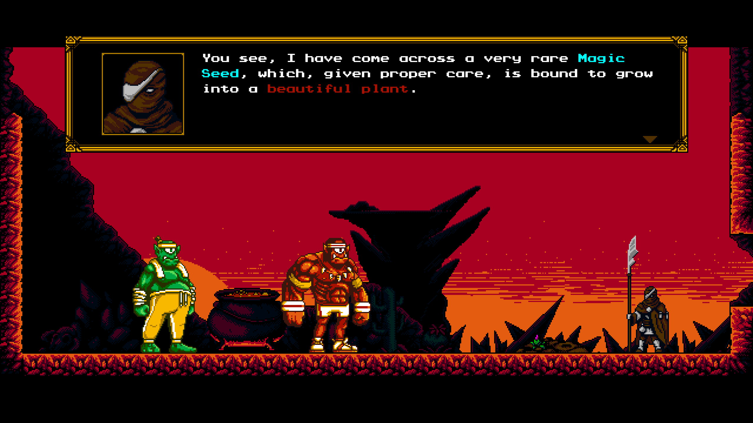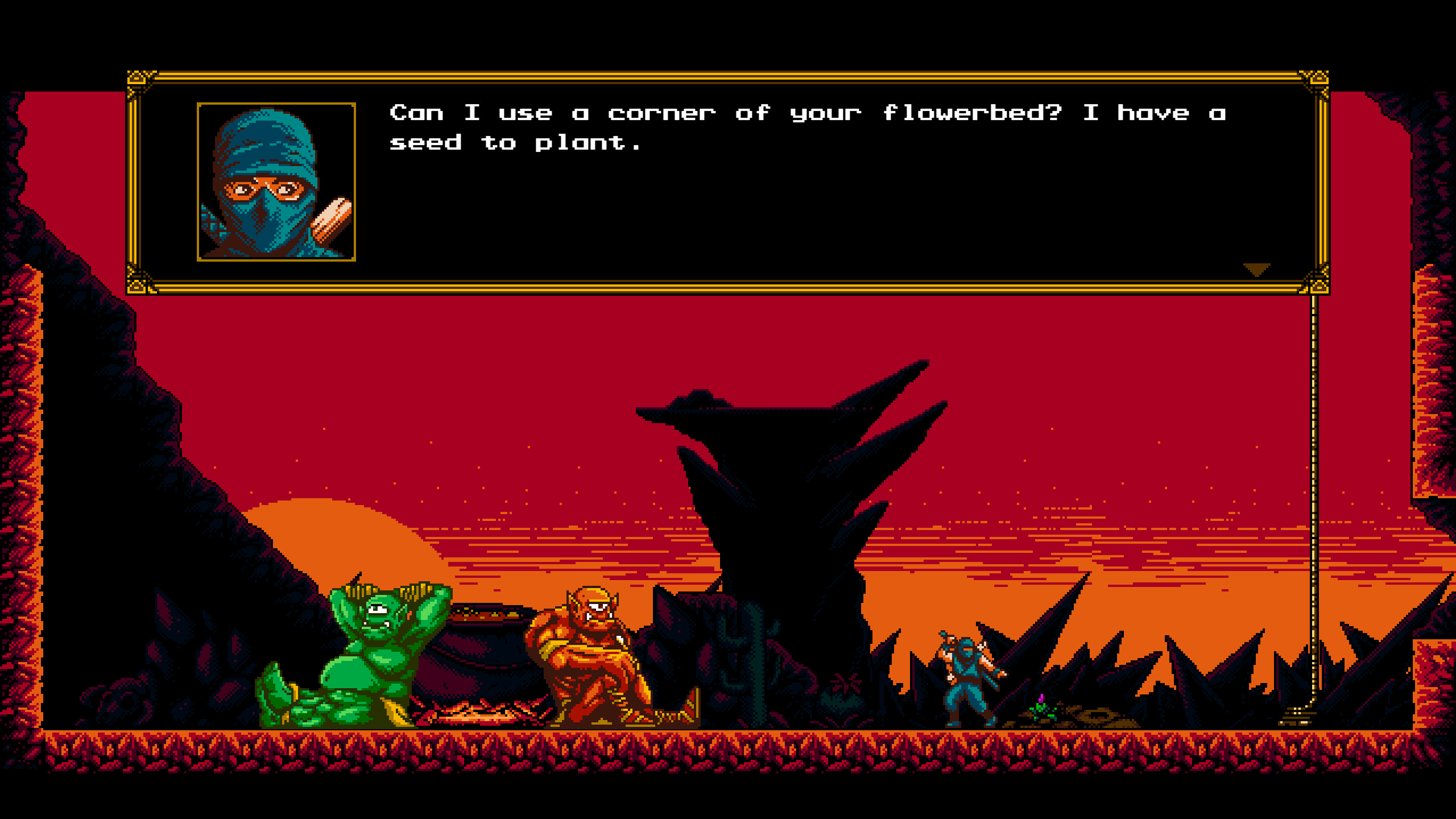 Also at any point after gaining the power to freely time time travel, Ninja eventually returns to Colos and Suses's room in 8-bit while he has the Astral Seed in his inventory. Ninja then interacts with Colos and Suses's flowerbed, asking the two colossi if he has permission to use a small corner of their flowerbed so he can plant his Astral Seed. Colos and Suses have no qualms and loudly agree in unison that Ninja may use their flowerbed. Ninja plants the Astral Seed, and a tiny green tea sprout appears in the flowerbed. Eventually, Ninja returns to the room in 16-bit and grabs the fully-grown Astral Tea Leaves, which he takes to the Ninja Elder.