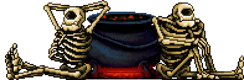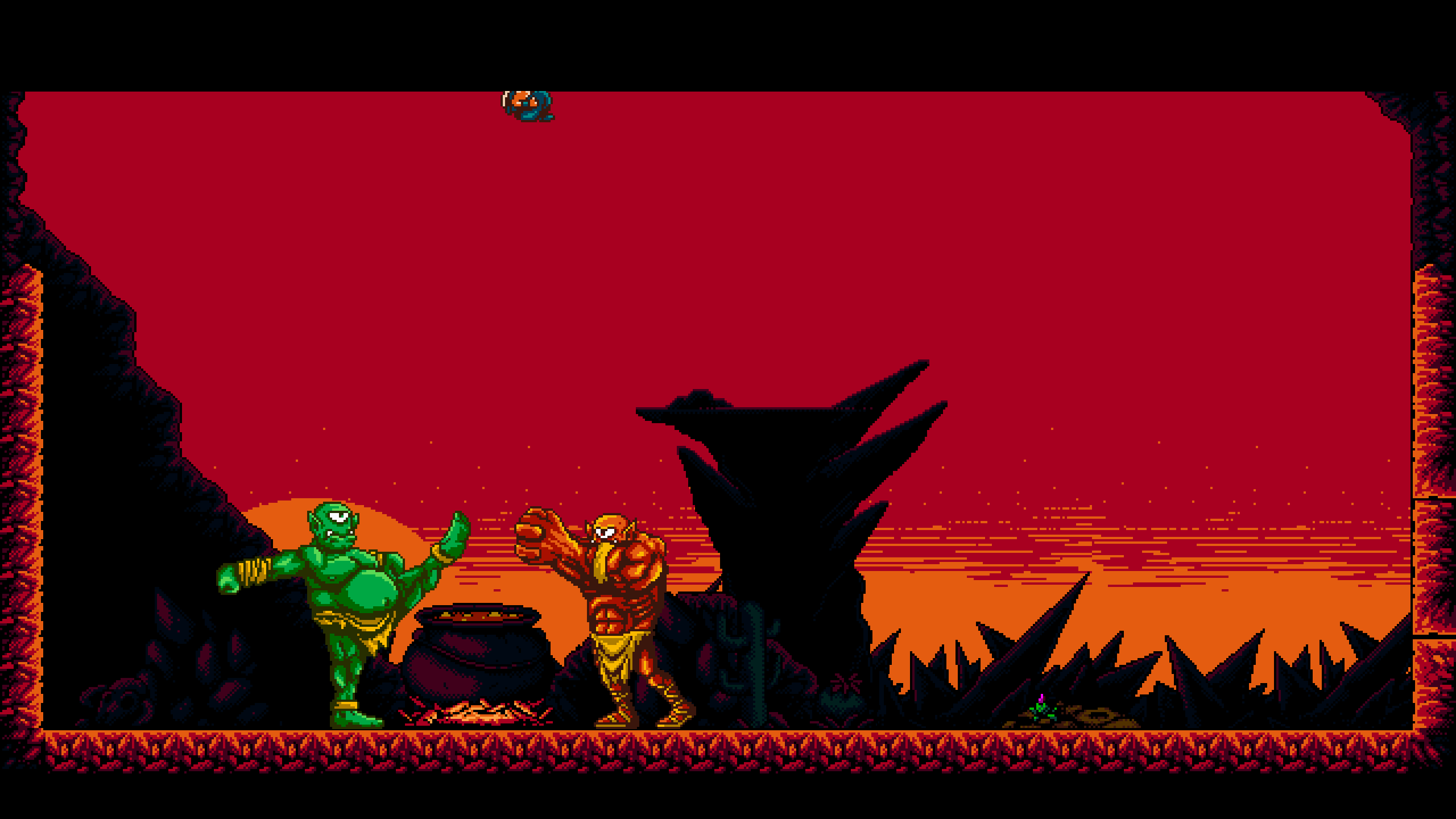 After Ninja gains the power to freely time travel, he returns to the room of Colos and Suses. If Ninja returns in 16-bit, the skeletons of Colos and Suses are seen sitting by the stew pot in poses identical to their sitting poses from the 8-bit period, implying they starved to death during the 500-year time gap. Ninja grabs the fully-grown Power Thistle from Colos and Suses's flowerbed and delivers the plant to them in 8-bit. Colos and Suses are shocked, but they gratefully add the Power Thistle to their stew and proceed to chug the stew down. The two of them are quite pleased by their meal, and they test their improved strength on Ninja, tossing Ninja onto the pathway towards the Key of Strength. Colos and Suses agree to take a rest, and, in unison, they shout their gratitude to Ninja.
