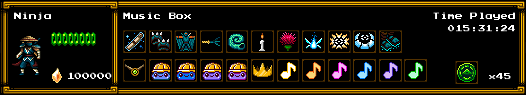 The inventory showcases various items and abilities Ninja has collected throughout the course of his journey in The Messenger.