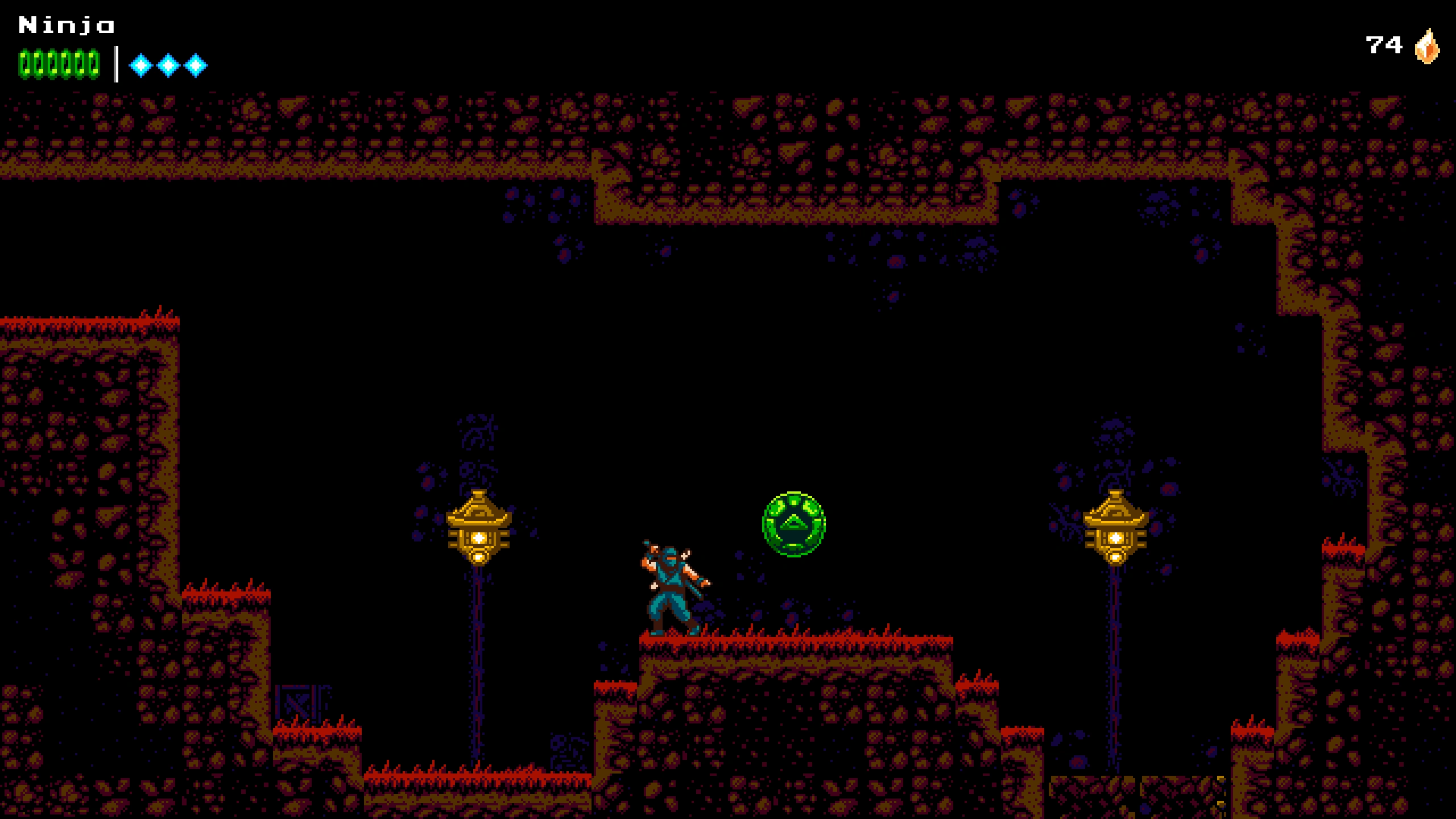 After Ninja collects his first Power Seal, The Shopkeeper appears and gives him a short explanation about Power Seals. Depending on the location of Ninja's first Power Seal, The Shopkeeper spawns in interesting locations. In Rivière Turquoise for example, The Shopkeeper spawns on an 8-bit Tower of Time floating blue block while she speaks to Ninja.