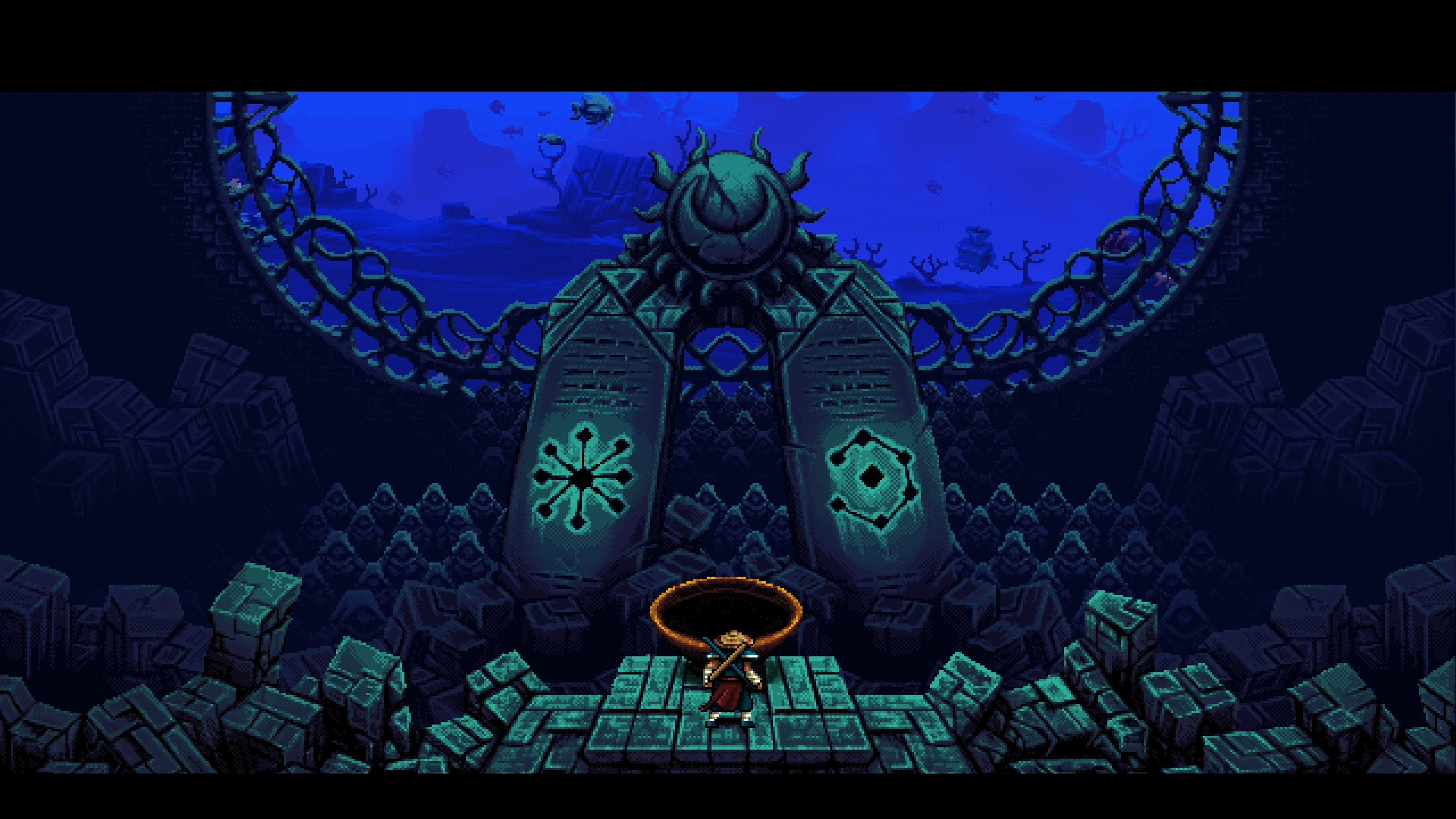 In 16-bit Sunken Shrine, during the Guardian Gods cutscene where Ninja is gifted the Key of Love, a small mill with a rotating crank floats in the ocean background and releases particles of salt. It is the only easter egg that's actually animated.